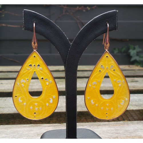 Mooie rosé Vergulde (over Sterling zilver) oorbellen met grote uitgesneden oranje Jade druppel in omlijsting.
