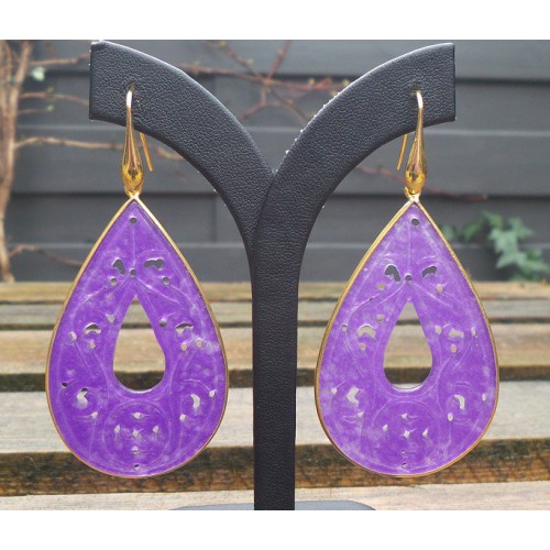 Mooie Vergulde (over Sterling zilver) oorbellen grote uitgesneden paarse Jade druppel in omlijsting.