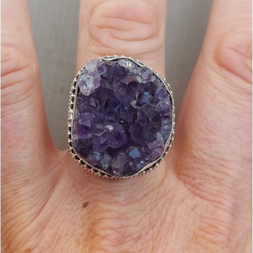 Zilveren ring gezet met ruwe Amethist in bewerkte setting 18 mm