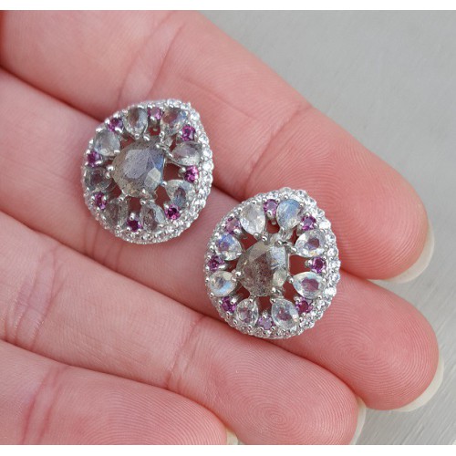 Mooie Sterling zilveren oorbellen gezet met Labradoriet, Rhodoliet Granaat en Zirkonia's.