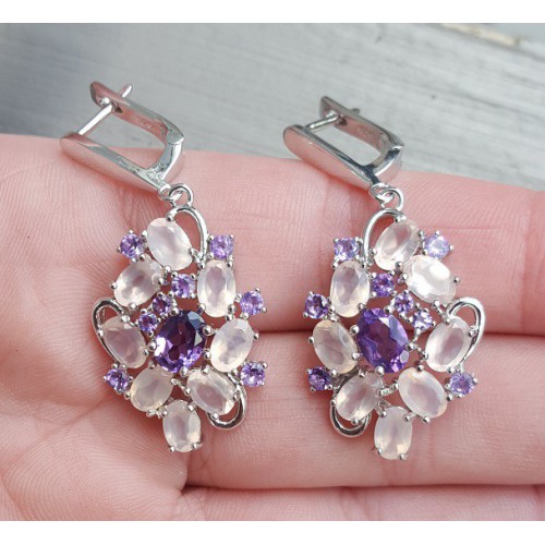 Mooie Sterling zilveren oorbellen gezet met Rozenkwarts en Amethist.