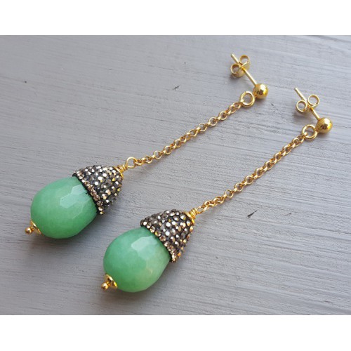 Mooie lange oorbellen met Chrysopraas en kristallen.