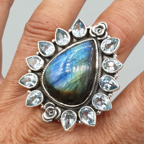925 Sterling zilveren ring gezet met Labradoriet en blauw Topaas.