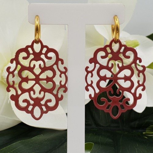Mooie Stainless steel creolen (nickelvrij) met ovale uitgesneden Buffelhoorn met rood gelakte binnenkant.