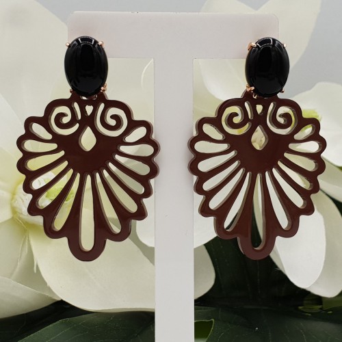 Mooie rosé Vergulde oorknoppen gezet met zwarte Onyx en beige bruin gelakte Buffelhoorn hanger.