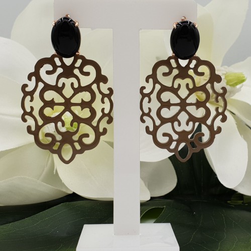 Mooie rosé Vergulde oorknoppen gezet met zwarte Onyx en ovale Buffelhoorn hanger met poema print.