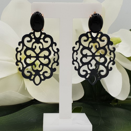 Mooie rosé Vergulde oorknoppen gezet met zwarte Onyx en donker grijs gelakte Buffelhoorn hanger.
