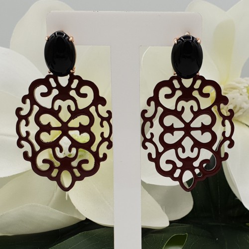 Mooie rosé Vergulde oorknoppen gezet met zwarte Onyx en donker rood gelakte Buffelhoorn hanger.