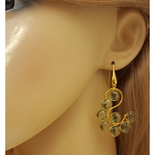 Mooie Vergulde over sterling zilveren oor haakjes met eronder hangers van ronde facet geslepen groene amethisten in vergulde omlijsting.