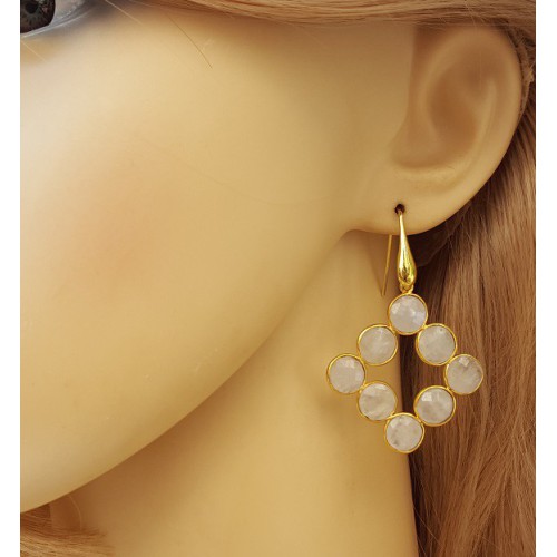 Vergulde over sterling zilveren oor haakjes met eronder hangers van ronde facet geslepen regenboog Maanstenen in vergulde omlijsting.