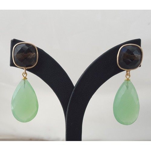 Mooie Vergulde (over Sterling zilver) oorbellen met Smokey Topaas en groene Chalcedoon.