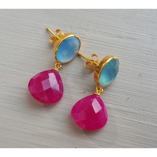 Mooie Vergulde (over Sterling zilver) oorbellen met fuchsia roze Chalcedoon en blauwe Chalceodoon.