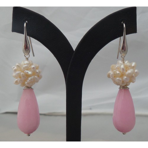 Mooie Sterling zilveren oorbellen met roze Jade briolet en bol van zoetwater Pareltjes.