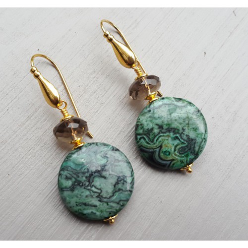 Mooie Vergulde (over Sterling zilver) oorbellen met ronde Jaspis en Smokey Topaas rondel.