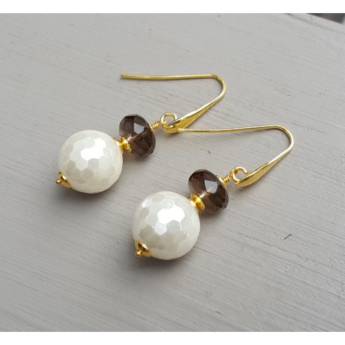 Mooie Vergulde (over Sterling zilver) oorbellen met bol van Parelmoer en Smokey Topaas rondel.