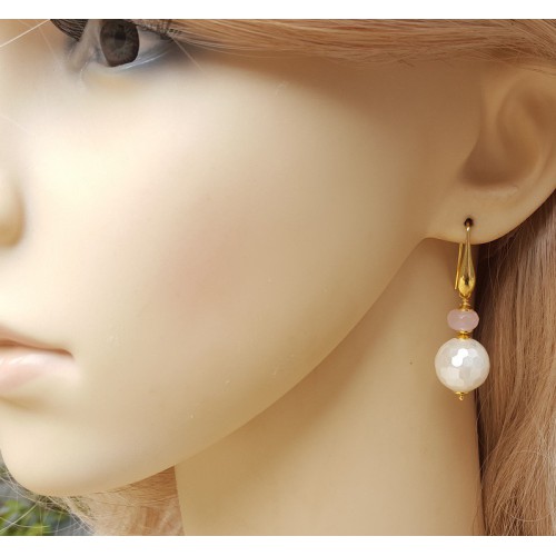 Mooie Vergulde (over Sterling zilver) oorbellen met bol van Parelmoer en Rozenkwarts rondel.