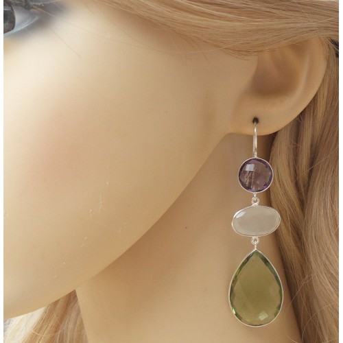 Mooie Sterling zilveren oorbellen gezet met Amethist, groene Amethist en regenboog Maansteen.