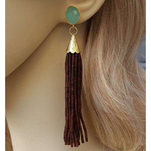 Mooie lange oorbellen van bruine kraaltjes en Vergulde (over Sterling zilver) oorsteker gezet met aqua Chalcedoon.