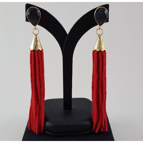 Mooie lange oorbellen van rode kraaltjes en Vergulde (over Sterling zilver) oorsteker gezet met Labradoriet.