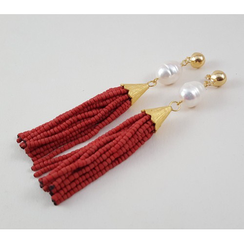 Mooie lange oorbellen van rode kraaltjes, en met grote zoetwater Parel en Vergulde (over Sterling zilver) oorsteker.
