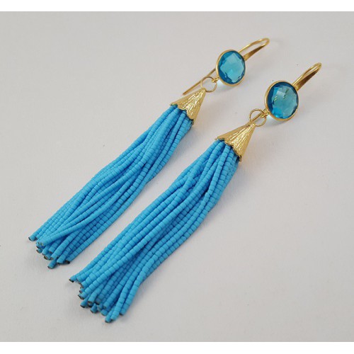 Mooie lange oorbellen van Turkoois blauwe kraaltjes en Vergulde (over Sterling zilver) oorsteker gezet met blauw Topaas.