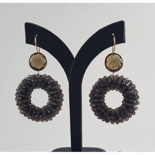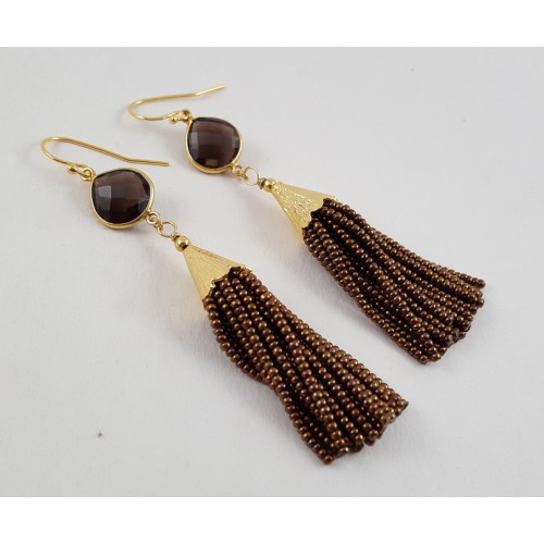 Mooie oorbellen van bruine kraaltjes en Vergulde (over Sterling zilver) connector gezet met Smokey Topaas en oorhaakjes.