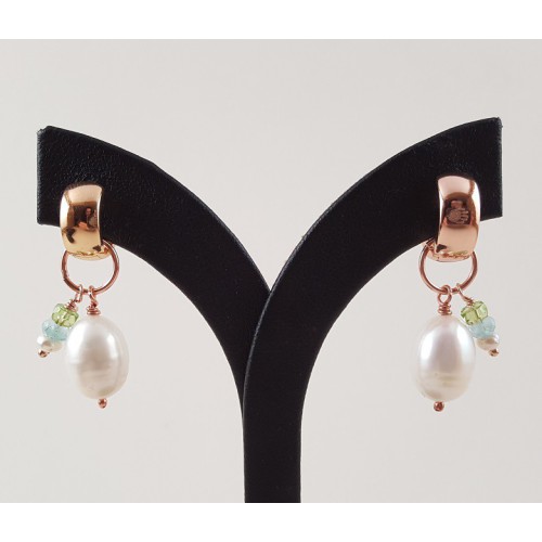 Rosé vergulde creolen met zoetwater Parel, Peridot en blauw Topaas.