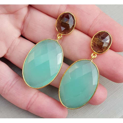 Mooie Vergulde (over Sterling zilver) oorbellen gezet met aqua Chalcedoon en Smokey Topaas.