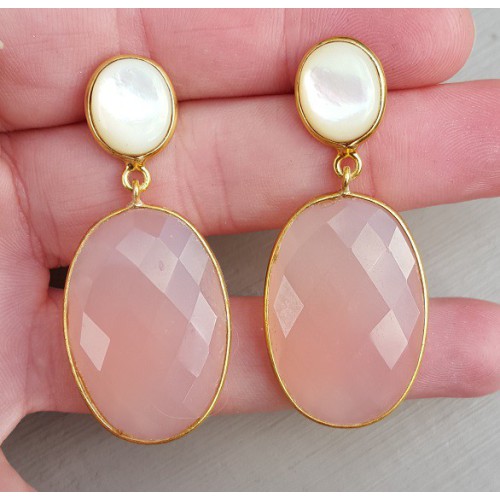 Mooie Vergulde (over Sterling zilver) oorbellen gezet met roze Chalcedoon en Parelmoer.