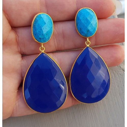 Mooie Vergulde (over Sterling zilver) oorbellen gezet met Turkoois en kobalt blauw Chalcedoon.