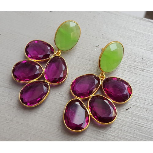 Mooie Vergulde (over Sterling zilver) oorbellen gezet met appeltjes groene Chalcedoon en roze Toermalijn quartz.
