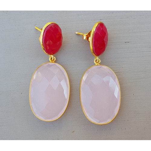 Mooie Vergulde (over Sterling zilver) oorbellen gezet met fuchsia roze Chalcedoon en roze Chalcedoon.