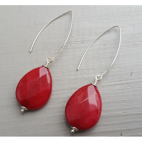 Mooie Sterling zilveren oorbellen met Robijn rode Jade briolet.