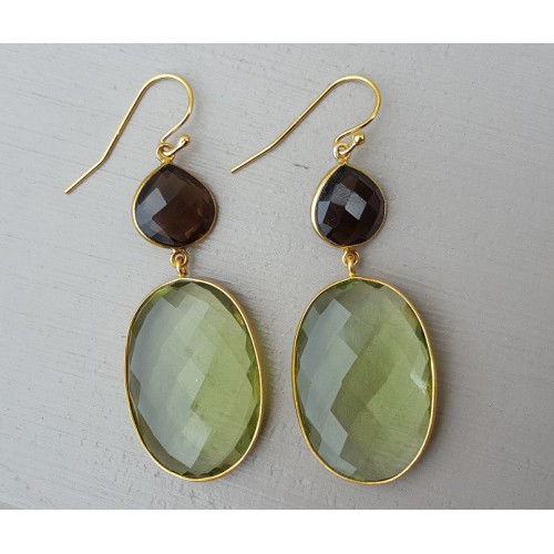 Mooie Vergulde oorbellen met Smokey Topaas en groene Amethist.