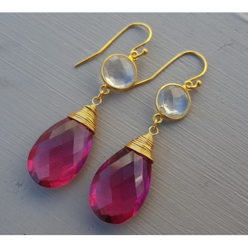 Mooie Vergulde oorbellen met roze Toermalijn quartz briolet en Bergkristal.