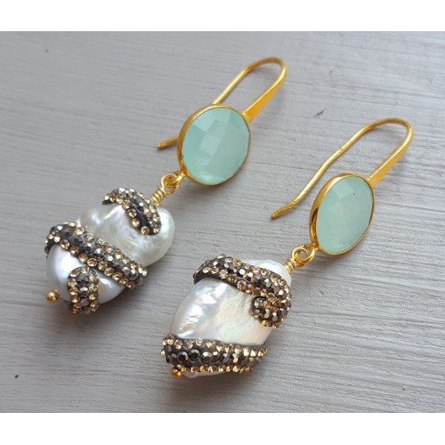 Mooie Vergulde (over Sterling zilver)oorbellen met aqua Chalcedoon, Parel en kristallen.