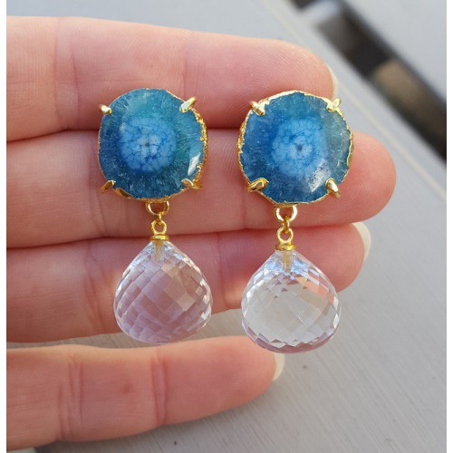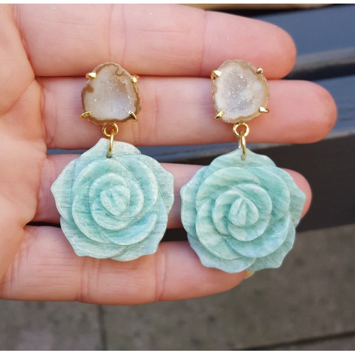 Mooie oorbellen met Vergulde (over messing) oorknoppen gezet met Agaat geode en bloem van Amazoniet.