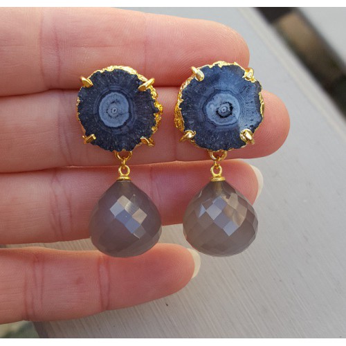 Mooie Vergulde oorbellen met grijze Agaat briolet en grijze Chalcedoon steentjes.