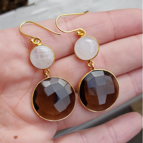Mooie Vergulde oorbellen gezet met regenboog Maansteen en Smokey Topaas.