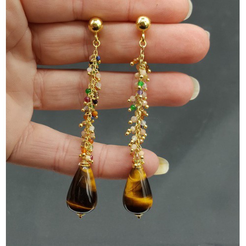 Mooie Vergulde oorbellen met multi steentjes en Tijgeroog briolet.
