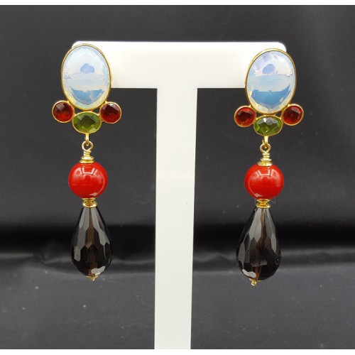 Mooie Vergulde (over Sterling zilver) oorbellen met Opaliet, groene en rode quartz, Smokey Topaas en Koraal.