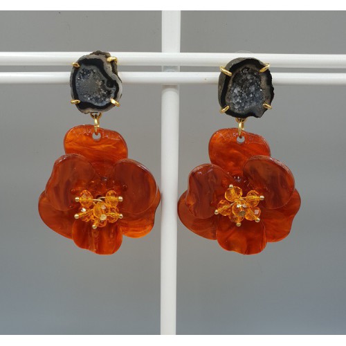 Mooie Vergulde (over messing nikkelvrij) oorknoppen met Agaat geode en hanger van oranje / rode resin bloem hanger.