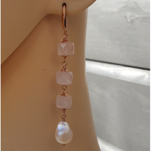 Mooie lange oorbellen met Rozenkwarts en Keshi Parel.