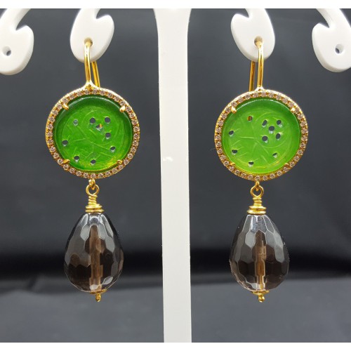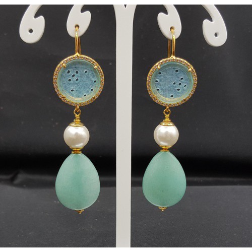Mooie oorbellen met Vergulde (nikkelvrij) oorhaken gezet met uitgesneden (carved) Jade en zirkonia.