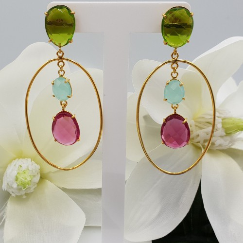 Mooie Vergulde (over Sterling zilver) oorbellen met Peridot quartz, roze Toermalijn quartz en Chalcedoon.