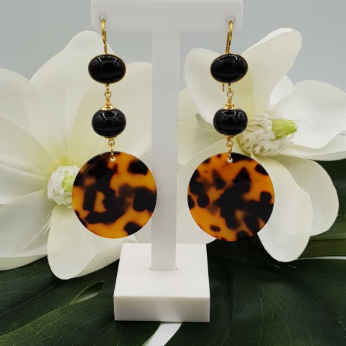 Mooie Vergulde (over Sterling zilver) oorbellen met zwarte Onyx en resin.