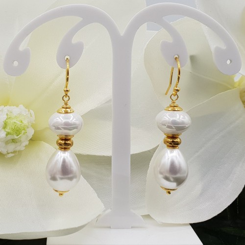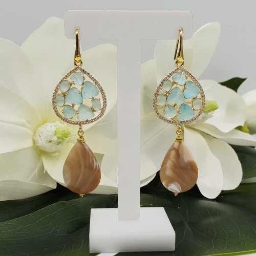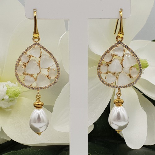 Mooie Vergulde (over Sterling zilver) oorbellen met Kwartsiet en Parel van schelp.