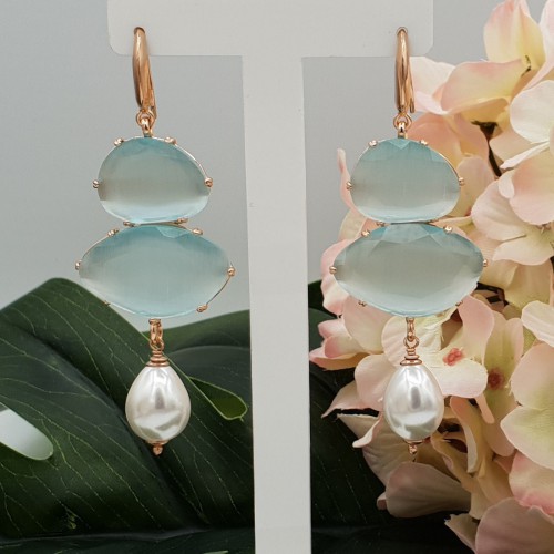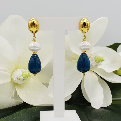 Mooie oorbellen met goud kleurige steker (nikkelvrij) gezet met blauwe Kattenoog en Parel.