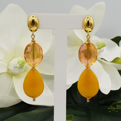 Mooie Vergulde (over Sterling zilver) oorbellen met gele Jade en kristal.