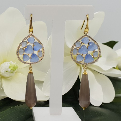 Mooie Vergulde (over Sterling zilver) oorbellen met licht blauwe Kattenoog en grijze Agaat.